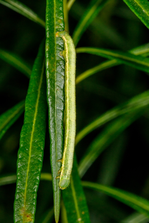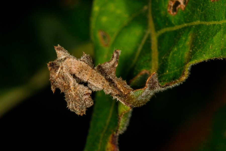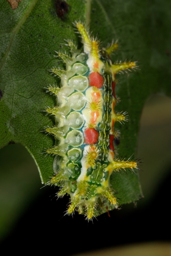 When photographing caterpillars at night, I am using my usual macro lens and a flash specifically made for macro work (two lights at the end of the lens with one on each side). This model lets me turn on the lights at various intensities so I can see what I am focusing on. My shutter speed is usually 1/200 and the aperture is in the f/11 to f/16 range. This combination lights the subject but leaves the rest of the image dark which results in a nicely highlighted subject. Thanks to Jim McCormac for this tip!