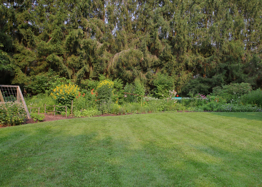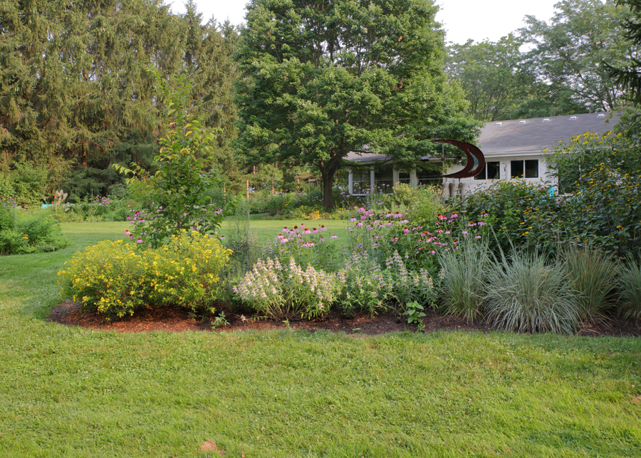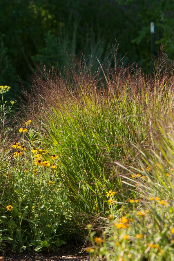 Regardless of design approach, be intentional about helping tall grasses to not flop (I speak from experience!) Factors include root competition, plants supporting each other, plant selection, and soil richness. In his book Prairie Up and in his blog, Benjamin Vogt advocates for dense installation of prairie plants. (3) He notes that root competition is the natural condition in prairies. Such competition keeps plants from getting over-sized and prone to flopping. Vogt thinks this is more important than plants propping up each other, but mutual support can help. In some instances, a particular “selection” of a native species may have the characteristic of standing on its own very well. A selection is a naturally occurring variation in a species and it is propagated by cuttings to preserve the trait (at the cost of genetic diversity). An example in our landscape is ‘Shenandoah’ Switch Grass. I have also heard that prairie plants may be prone to flopping if the soil is too rich in nitrogen.