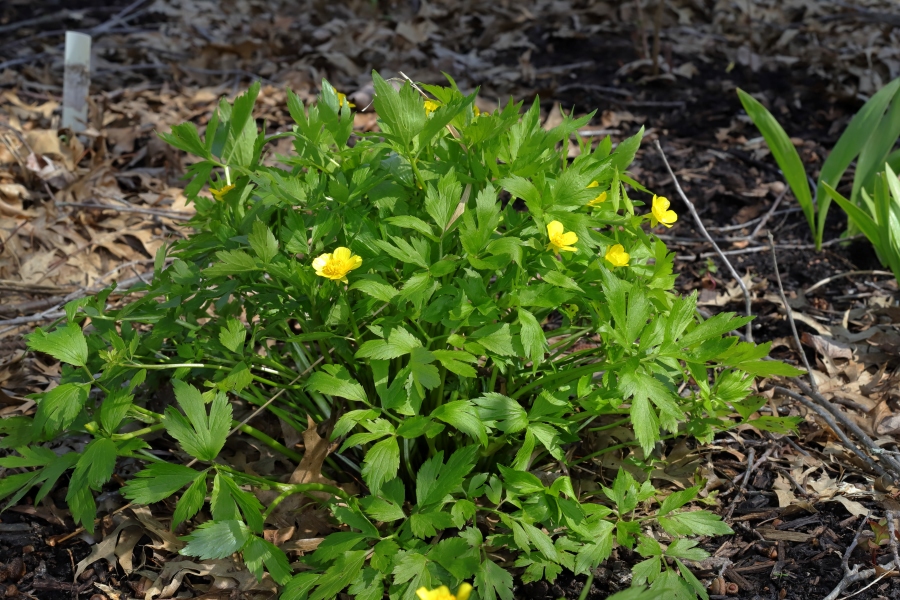 This buttercup prefers filtered sunlight in spring and light shade in the warm summer months. The petioles may be longer than the leaves. This explains why it appears that it has vines and is clambering over the patch to find some soil in which to root. No, what appeared to be vine-like growth was instead the long leaf stems, much longer in fact than the leaves. It grows to about 1 foot in height and although the main bloom is in mid-spring, it may continue to bloom sporadically throughout the summer. It makes a dense groundcover, suppressing all but occasional robust weeds.
