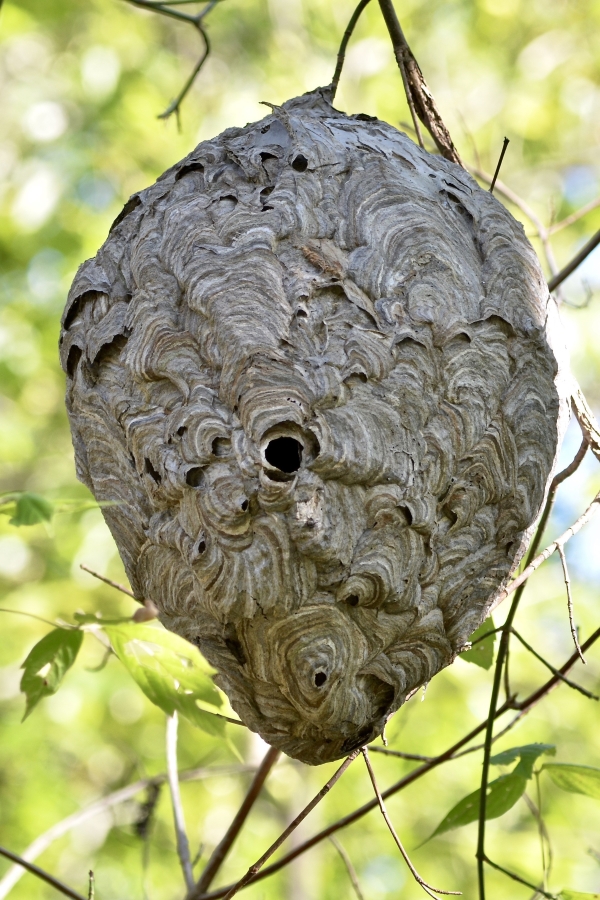 Baldfaced Hornets. Hornets nests can be large and hang in branches and building structures.