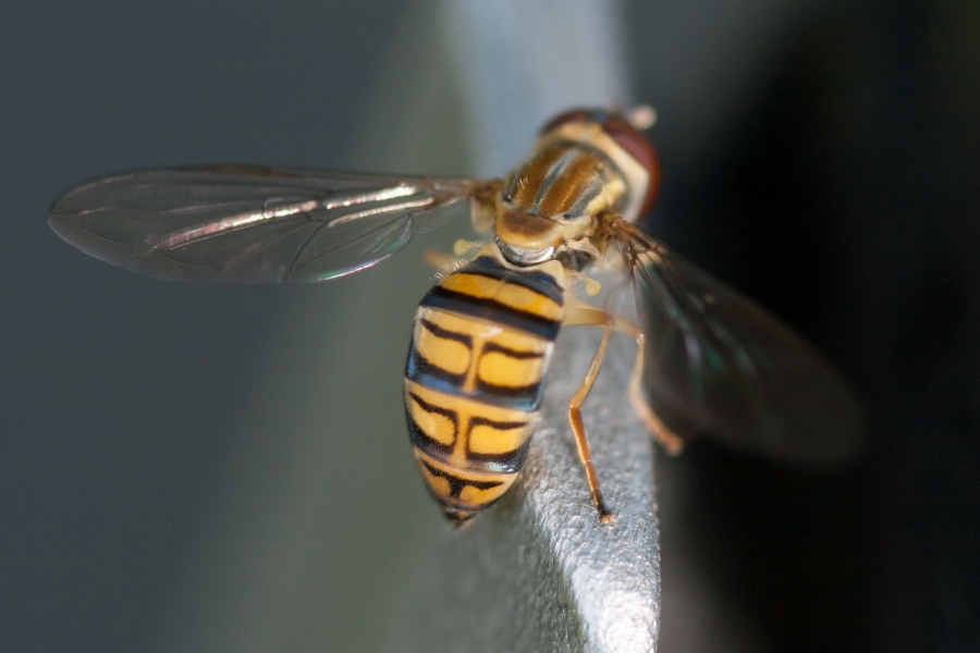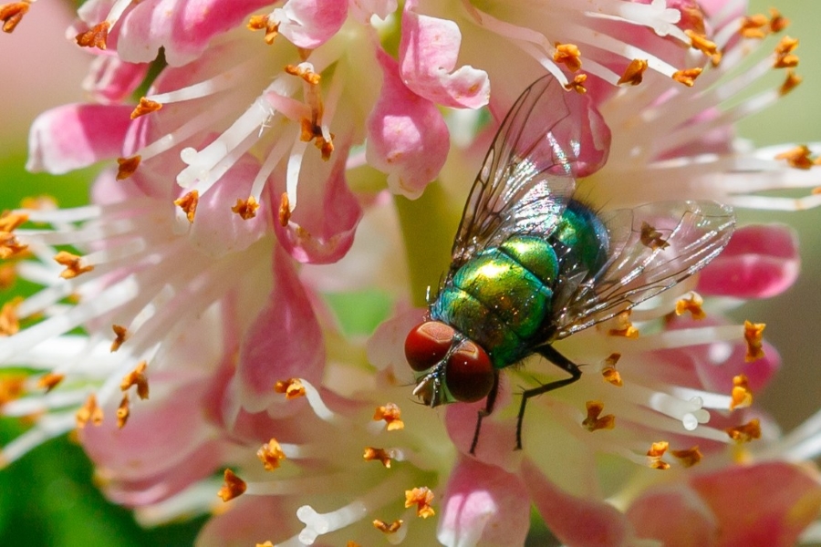 Flies are in the order Diptera and are distinct from other insects because they only have one pair of wings (in front). The second pair of wings typical of other insects “is reduced to small, knob-like structures called halteres, which they use for balance in flight.” (2) Adult flies have large eyes and relatively short antennae.