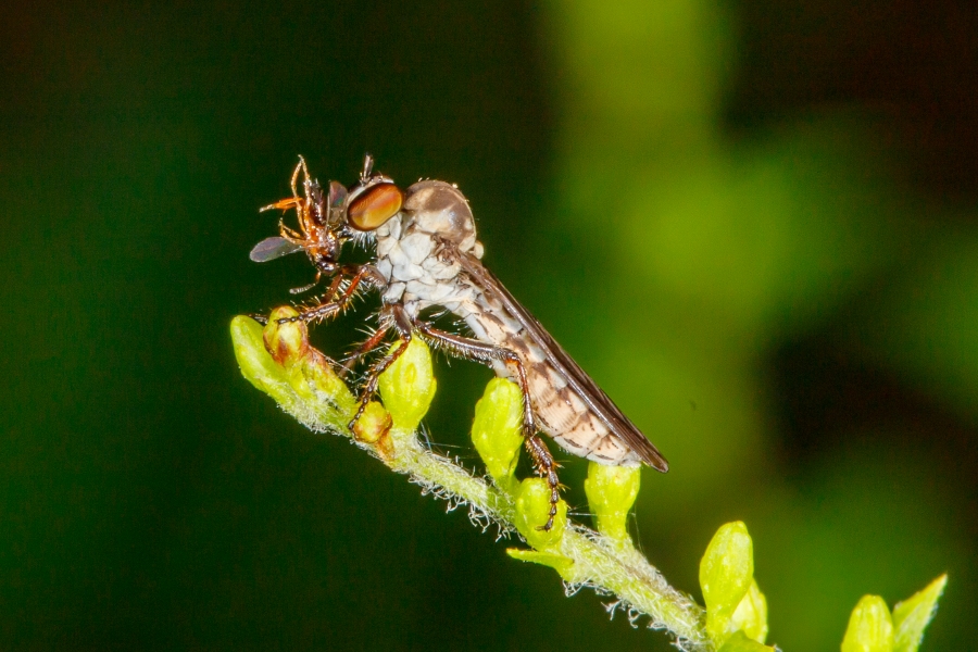 Robber flies, gnat ogres, long-legged flies, and snipe flies are predators as adults. They capture their prey then inject enzymes that create liquified food that can be sucked out. (4)