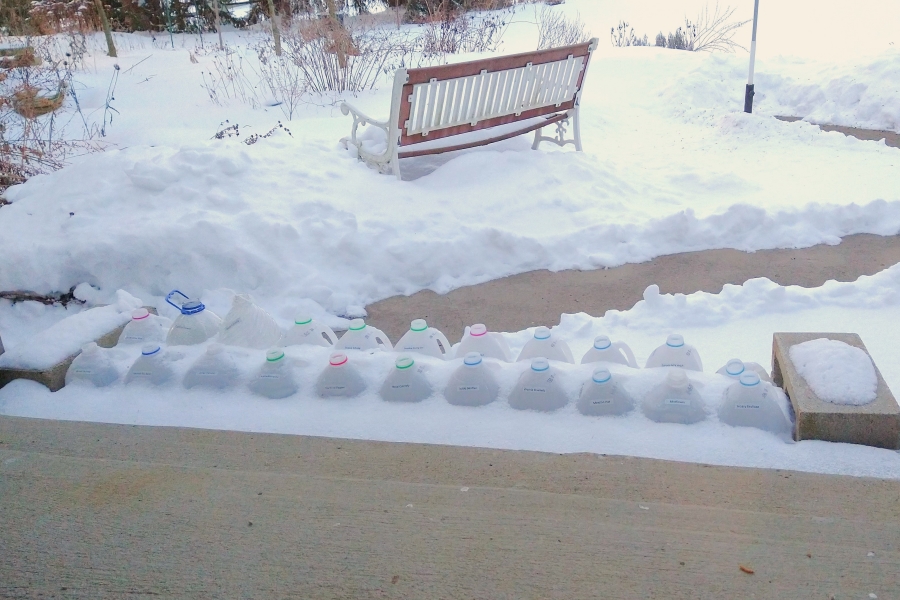 - Collect gallon milk/water jugs and rinse milk jugs thoroughly, then let them air dry (no lids needed)