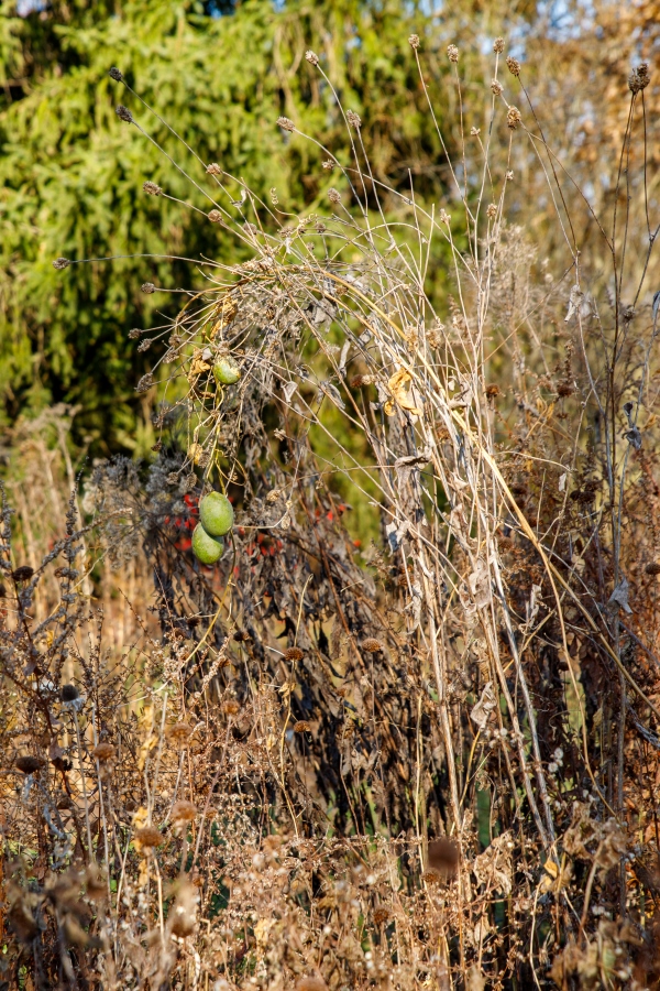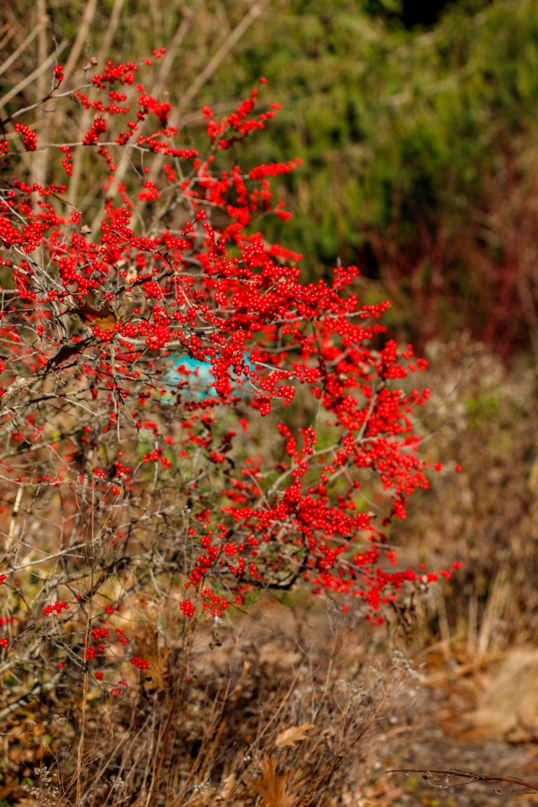 Now that the leaves are down from most trees and shrubs, it is a good time to get into the landscape for a bit of appreciation and assessment. Without foliage and the colors of the growing season, beauty emerges from the form, flow, texture, and earth tones present in the landscape. You can see the structures and textures of trees, shrubs, stalks of perennials, and grasses. The colors of berries, shrub stems, evergreens, and yard art draw interest rather than blooms.