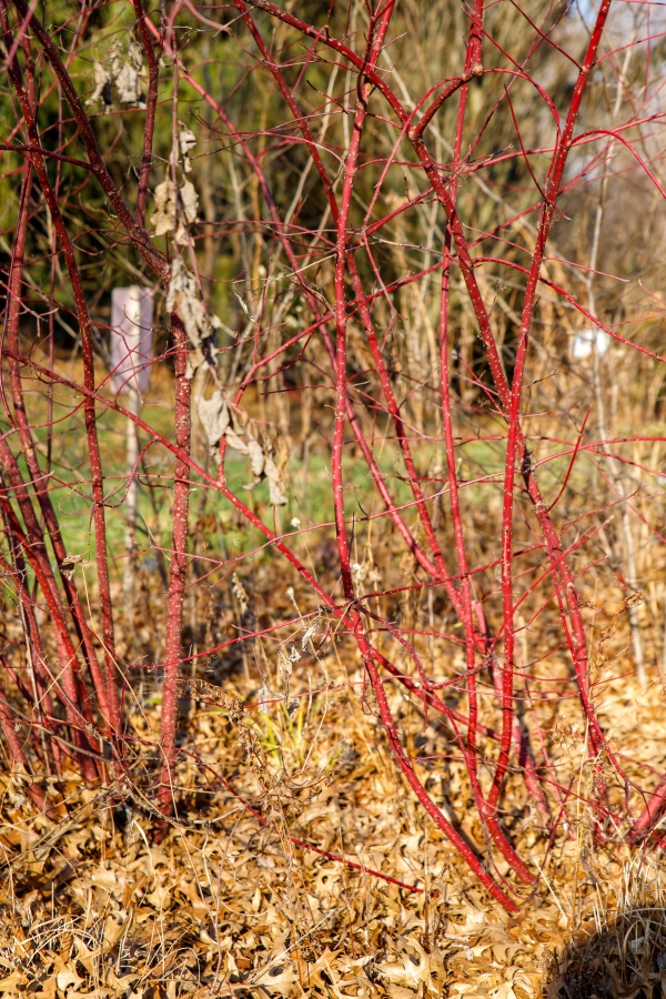 - Stem Color. The younger stems on some shrubs have nice color. Red-twig dogwood is a good native example. As the name implies, they have a red bark that is evident in winter. Pruning away older stems helps maintain the shrub’s color.