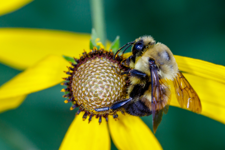 Social bumble bees (Bombus) ramp up to a peak in July. Solitary leaf-cutting bees (Megachile and Coelioxys) also peak in July. Some of the latest bees are solitary green bees (Augochloropsis and Augochlora) that peak in August. Apart from their peak, many bees continue some level of activity into October and some even into November.