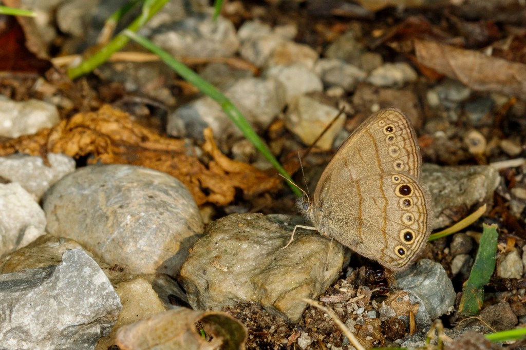 Common wood-nymphs (Cercyonis pegala) are in the brush-footed butterflies family (Nymphalidae) and the subfamily Satyrinae. Their appearance varies a good bit by area. They have one brood a year between May and October. The host plants are grasses, one of which is little bluestem. Eggs are laid in late summer and hatched caterpillars hibernate till spring.