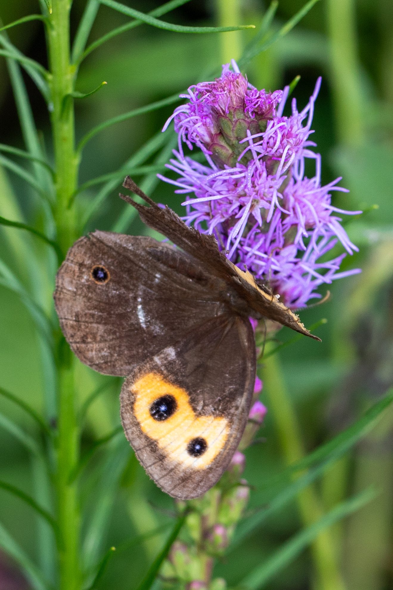 This summer we have frequently seen common wood-nymph butterflies in the landscape. Until I was able to get a positive identification, I wondered if they might be Carolina satyr butterflies (which turns out to be a wood-nymph cousin). Unfortunately, the frequent sightings have not yielded many photos because they are constantly moving (unless of course I don’t have my camera). Thus far I only have this one photo of a battered individual.