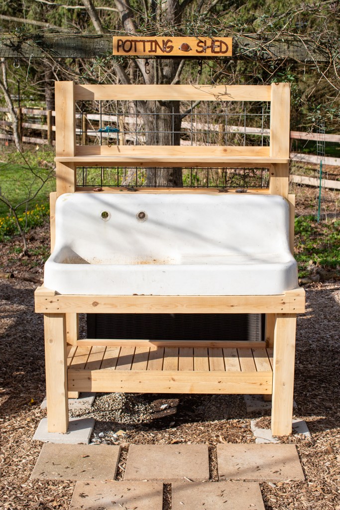 • I have been focusing on hardscape items: repairing raised bed and building a new potting bench (old farmhouse sink and cedar wood).