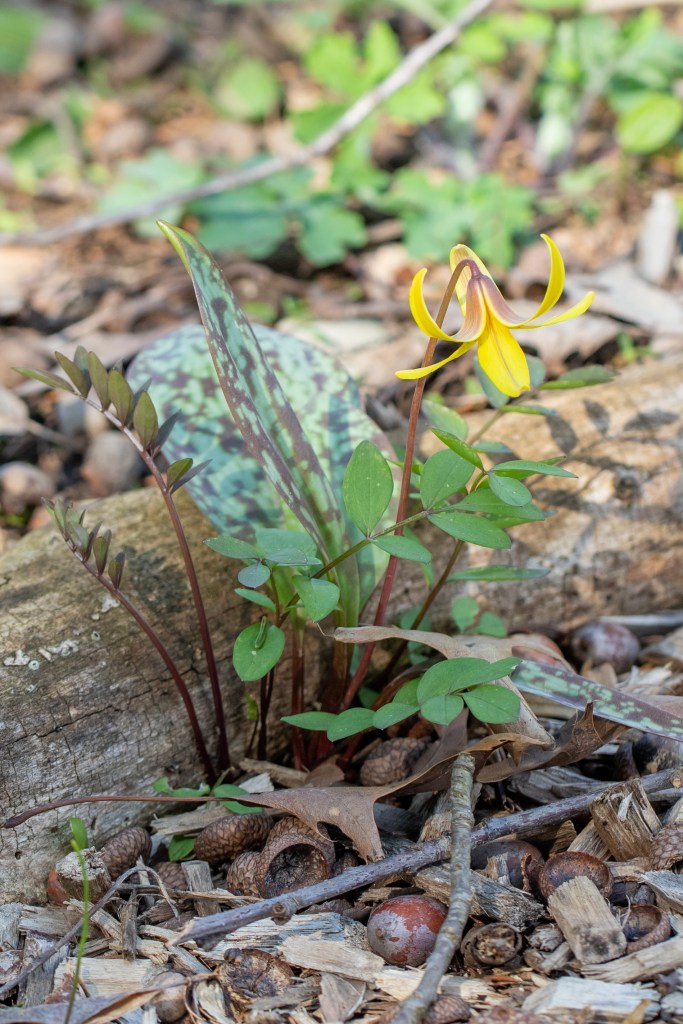 • Winter aconite, snow drops, and crocuses are done blooming (non-native spring bulbs) and now they are providing weed suppression with their foliage. They will die back and other plants will provide cover.